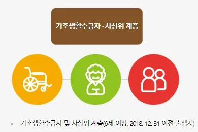 6세 이상, 2018.12.31 이전 출생자로 기초생활수급자 및 차상위 계층이 지원대상이 됩니다.