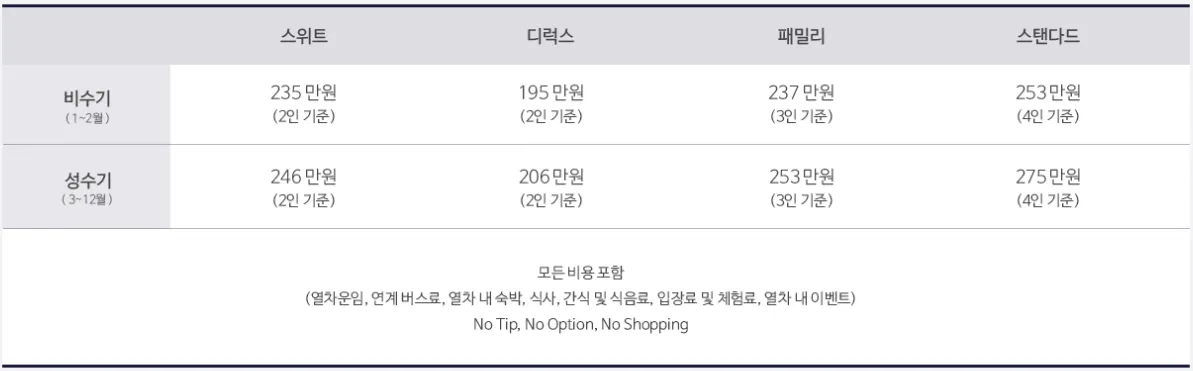 해랑열차의 가격표는 비수기와 성수기, 그리고 룸 형태에 따라서 다릅니다.
